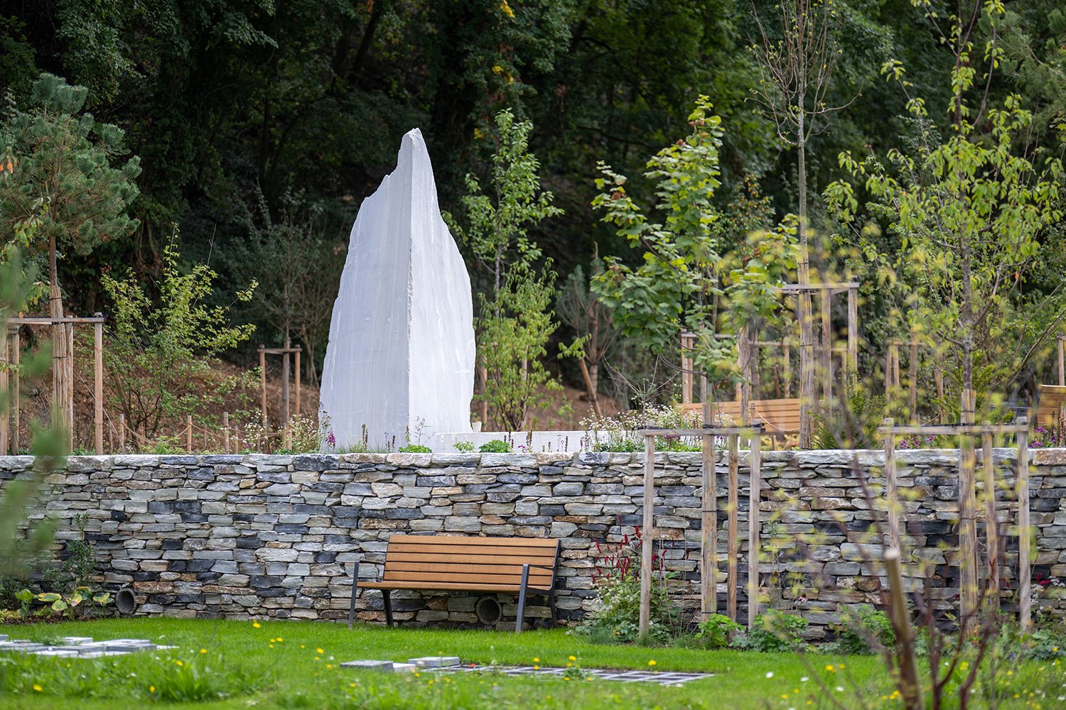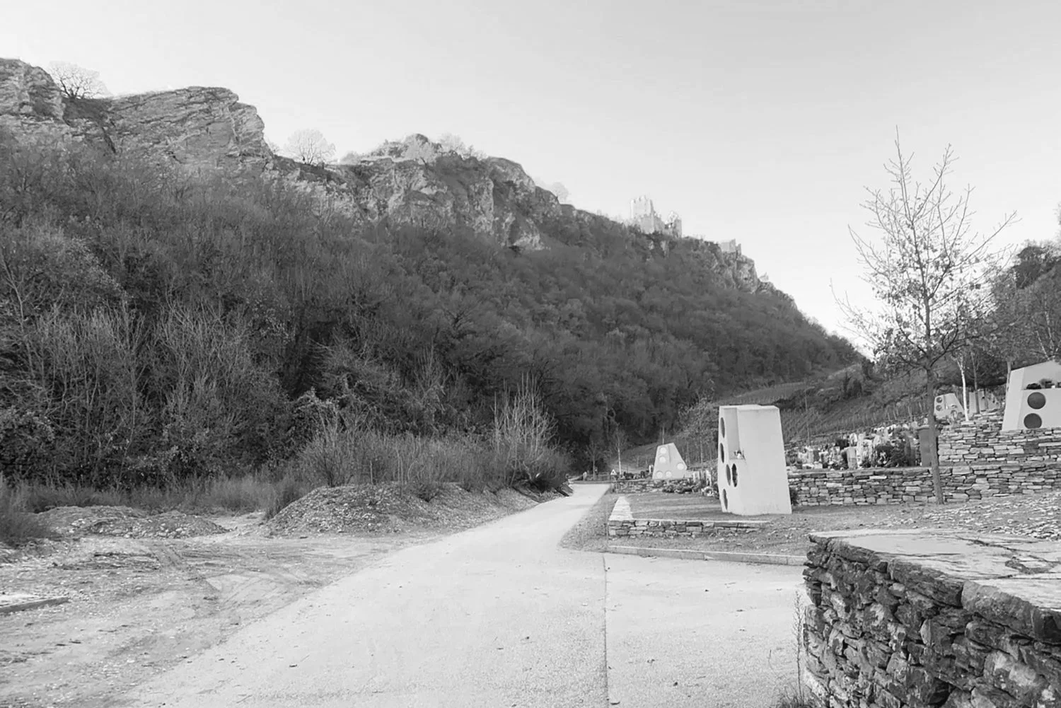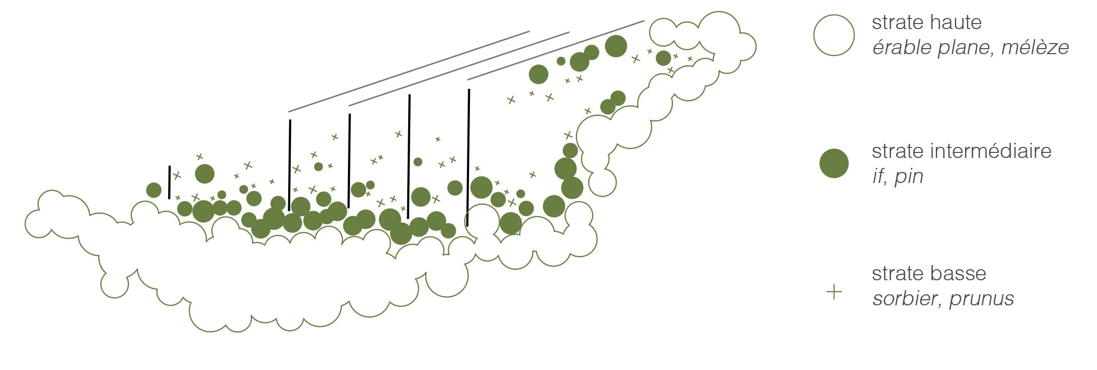 Le projet s’inscrit entre les vignes ensoleillées et la colline boisée de Tourbillon. Il travaille la couture fine avec la forêt et offre une ambiance s’inspirant du sous-bois forestier et de son jeu d’ombre et de lumière. Les nouvelles plantations réinterprètent cette richesse en évoquant l’atmosphère intime du sous-bois et la légèreté colorée des parterres. Les stèles sont installées à l’orée du bois, protégées par la couronne des arbres, elles regardent les coteaux ensoleillés.