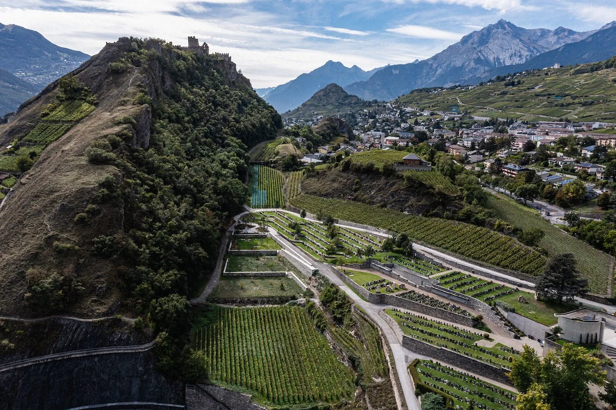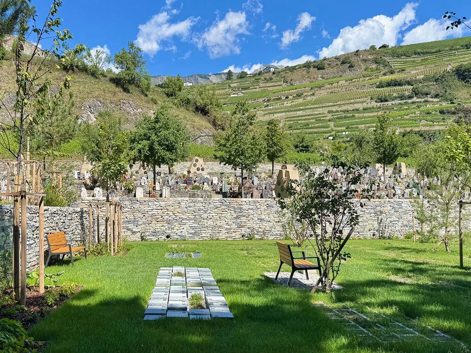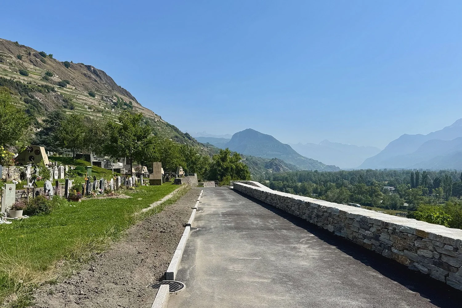 Inauguré en septembre 2025, le chantier, qui aura duré un an et demi, a permis d’aménager, sous le rocher de Valère, des terrasses végétalisées dans la partie sud du cimetière sur une surface de 2’500 m2, s’intégrant harmonieusement à la topographie existante.