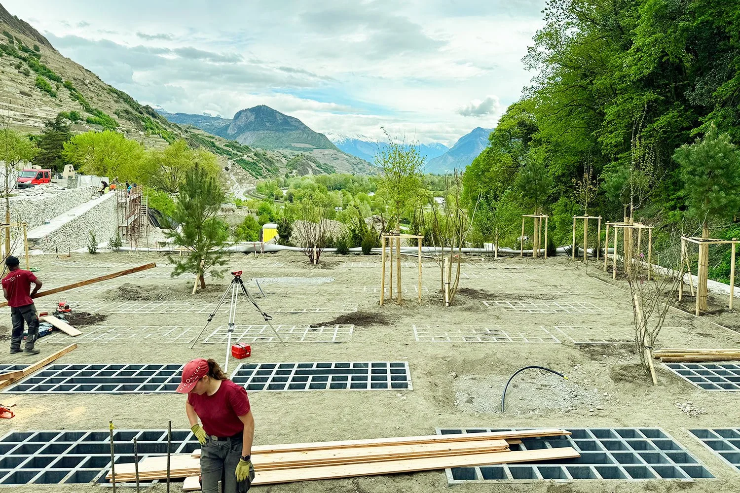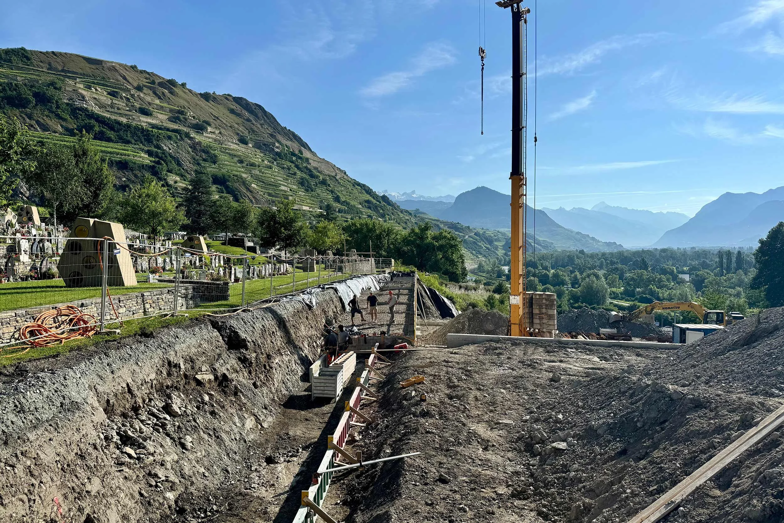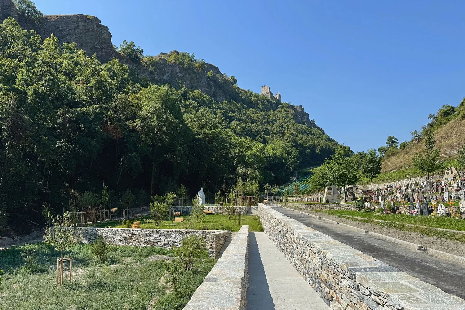 Inauguré en septembre 2025, le chantier, qui aura duré un an et demi, a permis d’aménager, sous le rocher de Valère, des terrasses végétalisées dans la partie sud du cimetière sur une surface de 2’500 m2, s’intégrant harmonieusement à la topographie existante.
