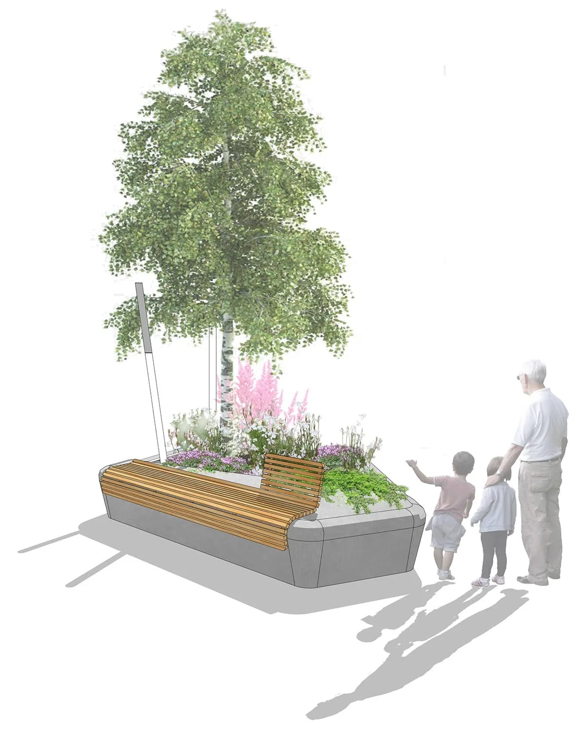 Afin de s’adapter aux enjeux climatiques et environnementaux, la rue est repensée avec des méandres végétalisés, formant de véritables îlots de fraîcheurs dans lesquels arbres et vivaces sont plantés en pleine terre. Ils participent activement à la régulation des températures, créent de l’ombre, favorisent la biodiversité et permettent d’infiltrer l’eau de pluie dans le sol.