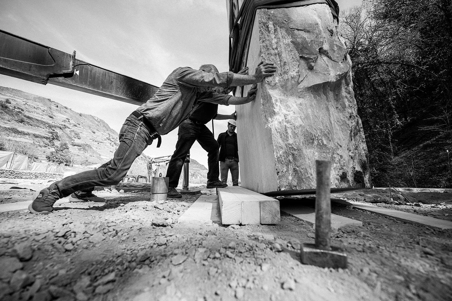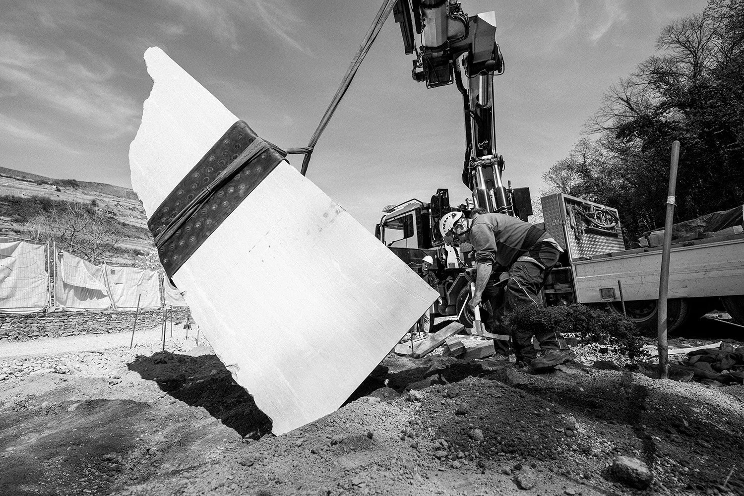 Le point d’orgue de la phase de chantier a été la mise en place de l’œuvre d’art, une opération de précision nécessitant le levage de deux blocs de pierre de 3 et 11 tonnes à l’aide d’un camion-grue.