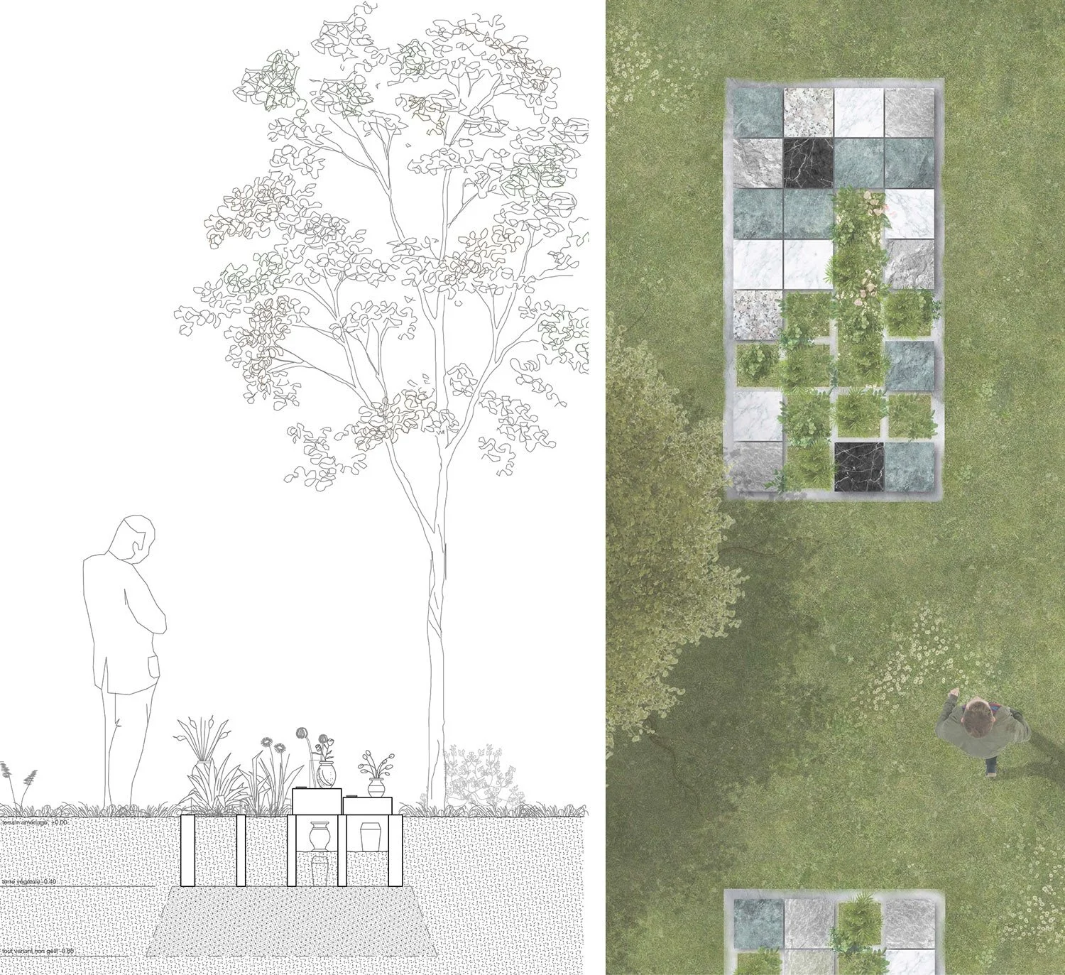 La densité d’urnes souhaitée nous a conduit à développer un columbarium avec des urnes mises en terre, faisant référence à l’ensevelissement traditionnel.
